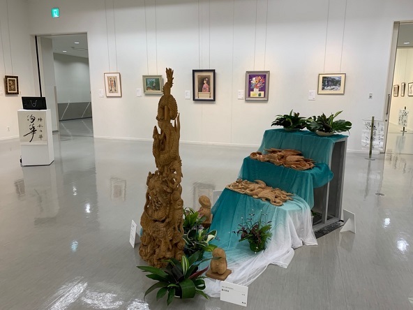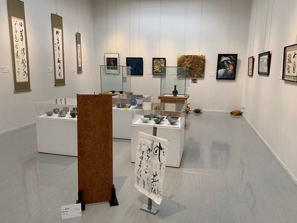 書道サークル作品の他、ゲスト出展者の陶器・書・絵画・写真・木彫など、