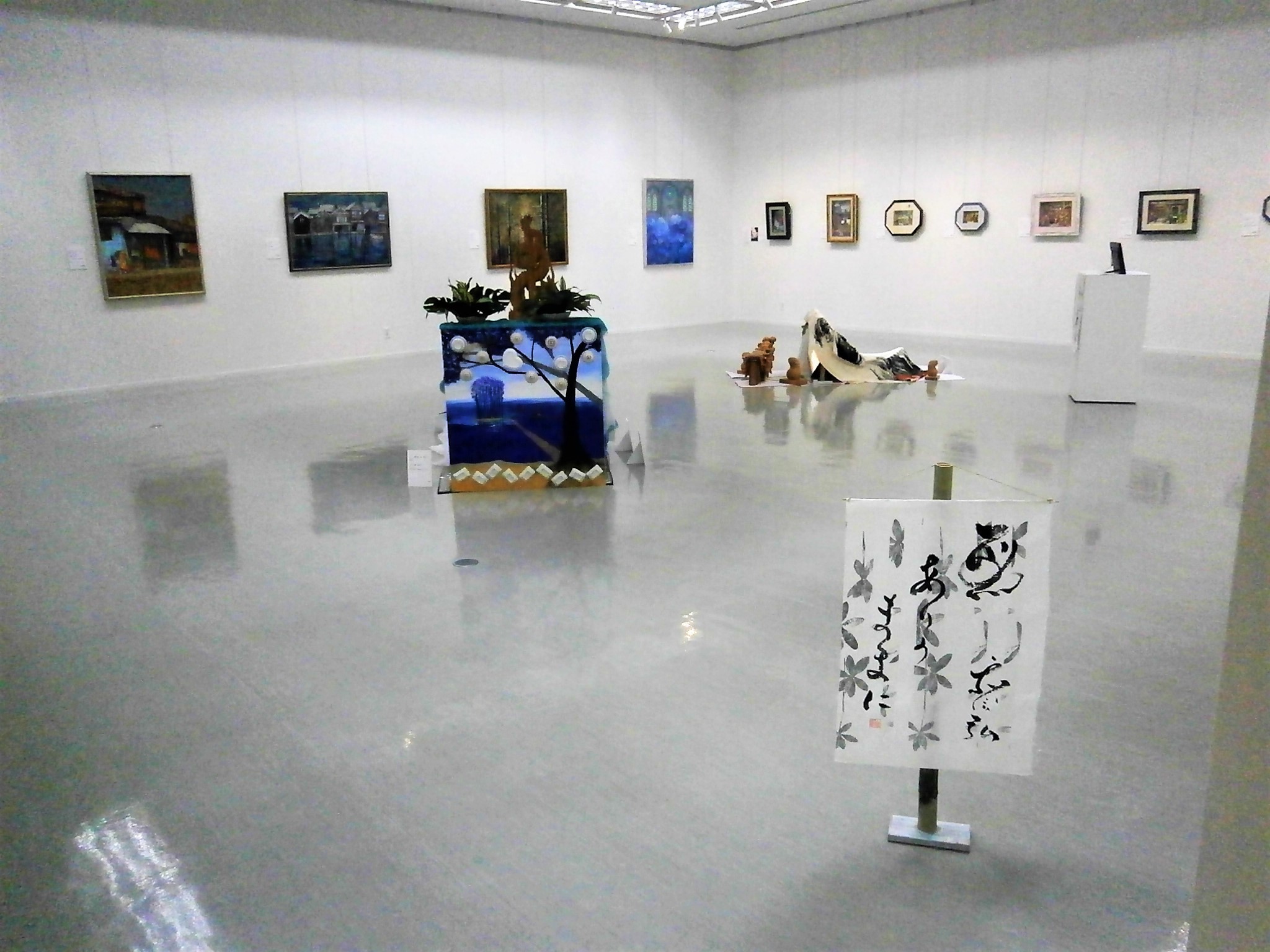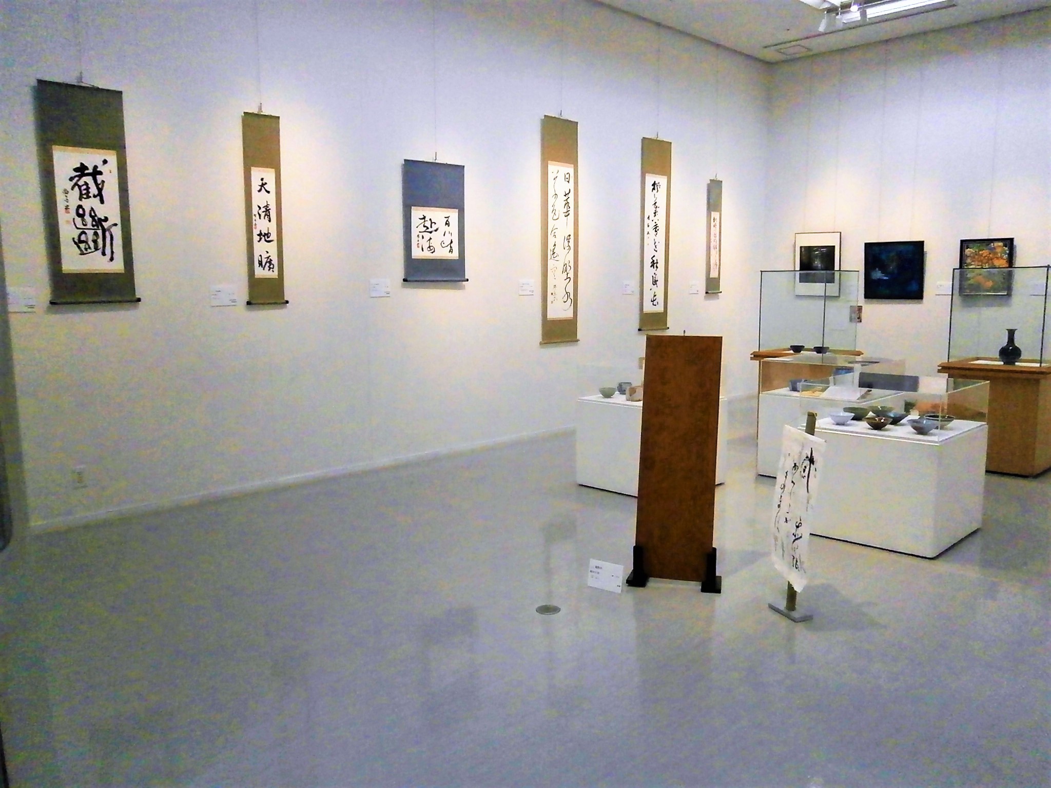 書道サークル作品の他、ゲスト出展者の陶器・書・絵画・写真・木彫など、